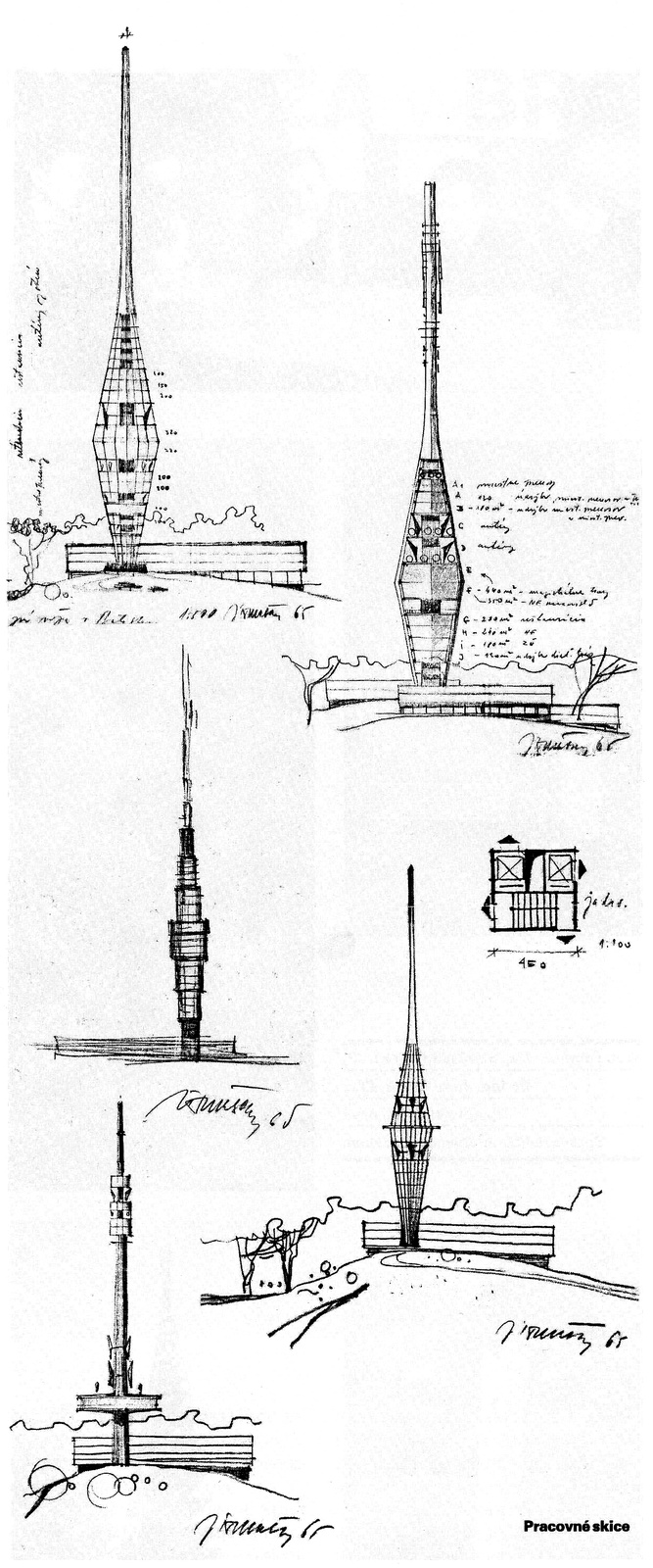 The 200m high Bratislava TV Tower replaced the old one from 1956. Visually attractive proposal of the tower in the form of two sharp pyramids connected in their basis was designed by architect Jakub Tomašák in cooperation with structural Stanislav Májek and Juraj Kozák. The experiment of hanging the entire floor area of the building in the height of 133 metrov structurally fixed on the central reinforced concrete core. The panoramatic restaurant with rotating floor reaches 506 m. above see level.