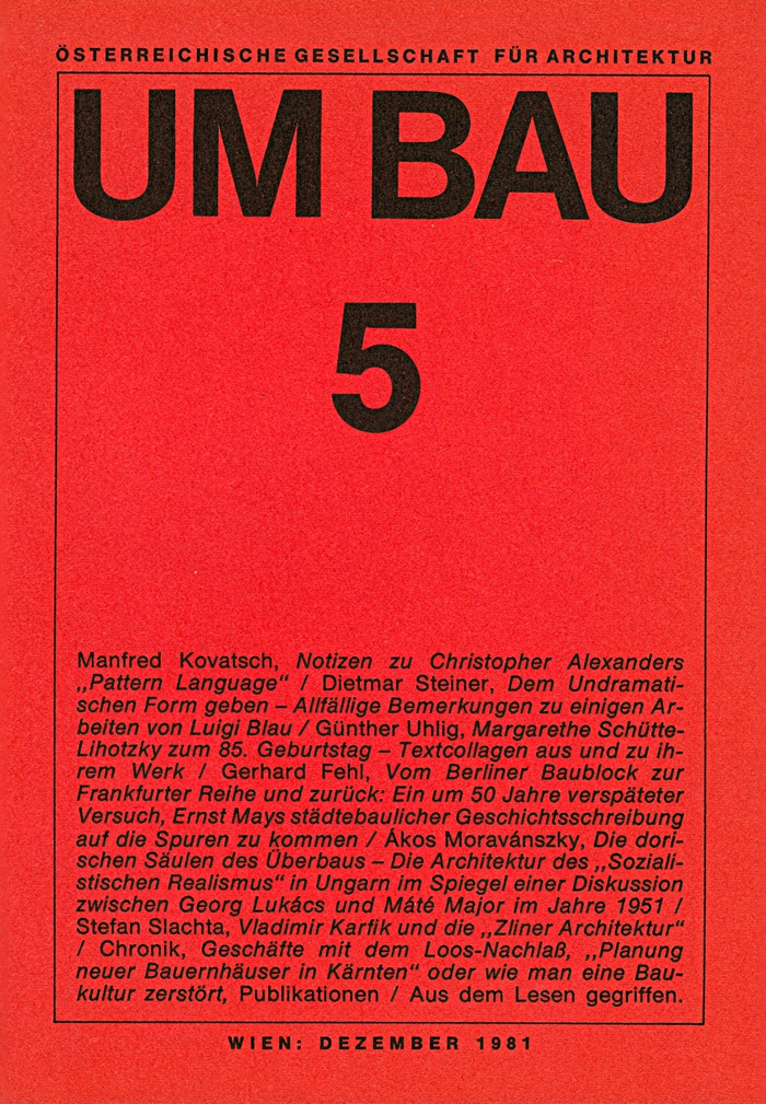 Wem der UmBau dennoch zu „langsam“ ist, wer die allgemeine Heroisierung des „Schinkel-Jahres“ vermisste – der sei darauf verwiesen, dass es immer noch einen Kontinuität der „modernen Architektur“ gibt. Vielleicht ist die Auswahl der Artikel für UMBAU 5 in diesem Sinne auch als programmatische Gegensteuerung zu werten. Wir wollen nicht auf die kurzlebigen Eruptionen der selbsternannten Szene antworten. So hat die alltägliche Erregung Zeit zur Verdauung. Sollte beim UMBAU dennoch eine gewisse Tendenz erkennbar sein, so ist diese auf die Diskussionen, Positionen und Auseinandersetzungen zurückzuführen, die schon mehrmals mit dem geheimnisumwitterten „Wiener Klima“ beschrieben worden sind.
