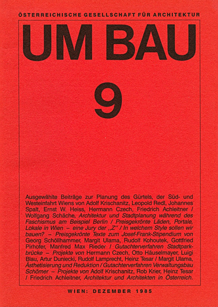 "In welchem Style sollen wir bauen" lautete, in Anspielung auf eine Debatte am Beginn des Historismus des 19. Jahrhunderts und auf den Aufsatzwettbewerb "Die alte und die neue Richtung in der Baukunst..." zur Jahrhundertwende, das Thema für schriftliche Einreichungen zum Josef-Frank-Stipendium 1984, wovon einige der preisgekrönten Beispiele in UmBau 9 erstmals publiziert werden.